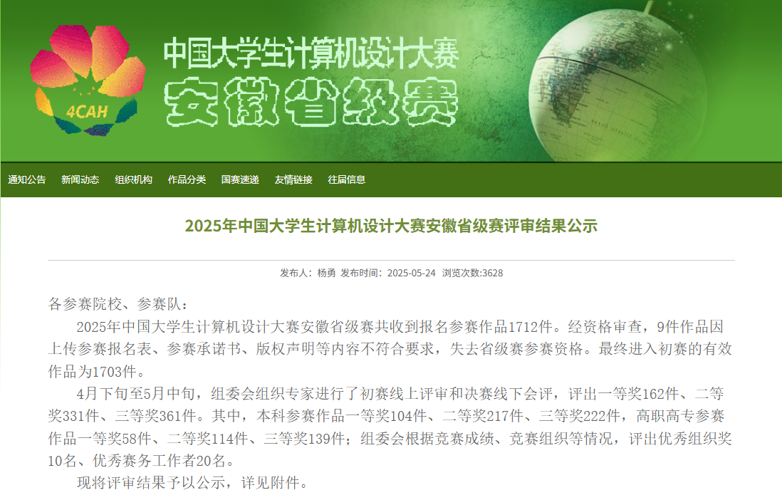 我校电子与信息工程学院学子在2025年中国大学生计算机设计大赛安徽省级赛中表现亮眼,凭借扎实的专业功底与创新实践能力,斩获多项荣誉。本次大赛中,我院学生共获得一等奖3项、二等奖3项、三等奖1项。取得了获一等奖数在全省参赛的43所本科高校并列第9名好成绩。其中4项作品被推荐参加在7月和8月份举行的全国总决赛。