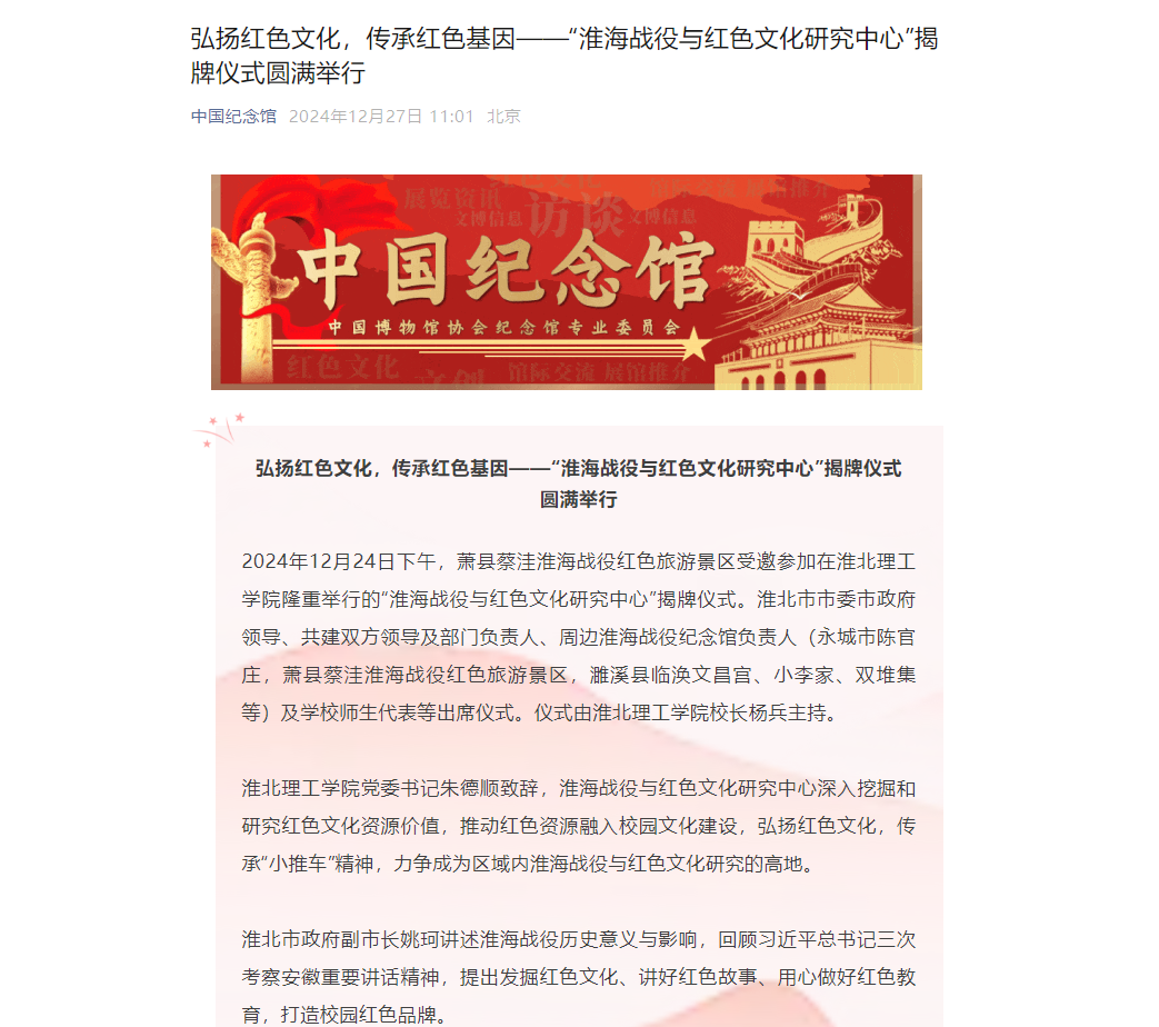 2024年12月24日下午,萧县蔡洼淮海战役红色旅游景区受邀参加在米兰·体育官方网站隆重举行的“淮海战役与红色文化研究中心”揭牌仪式。淮北市市委市政府领导、共建双方领导及部门负责人、周边淮海战役纪念馆负责人(永城市陈官庄,萧县蔡洼淮海战役红色旅游景区,濉溪县临涣文昌宫、小李家、双堆集等)及学校师生代表等出席仪式。仪式由米兰·体育官方网站校长杨兵主持。对此,中国纪念馆进行了报道: