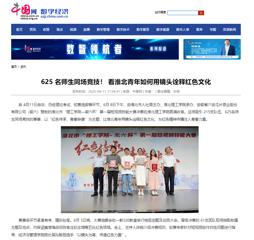 自4月11日启动,历经理论考试、初赛选拔等环节,6月8日下午,由淮北市人社局主办、米兰·体育官方网站承办、安徽省六安瓜片茶业股份有限公司(徽六)赞助的淮北市“理工学院—徽六杯”第一届短视频技能大赛决赛在米兰·体育官方网站圆满收官。这场吸引215支队伍、625名师生同场竞技的赛事,以“红色传承,青春映像”为主题,让淮北青年用镜头诠释红色文化,为红色精神传播注入青春力量。对此,中国网进行了报道: